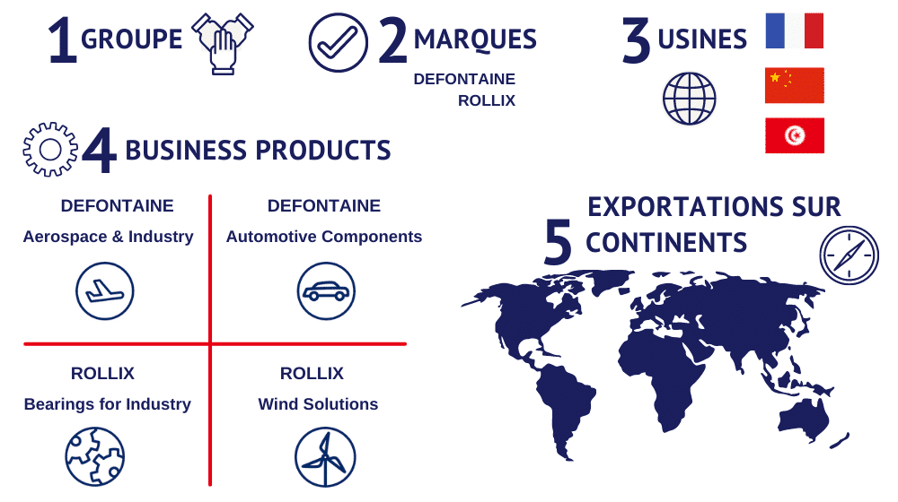 - Defontaine Aerospace & Industry: Wir haben bereits viel mehr als nur Flansche für Flugzeugmotoren hergestellt. Der neue Name ermöglicht es uns, alle unsere derzeitigen Produkte (Hubschraubergehäuse, Gondelflansche, KSB, …) einzubeziehen und unsere Strategie der Entwicklung in der Nicht-Luftfahrtindustrie zu unterstützen, wobei auch LKW-Kränze einbezogen werden.